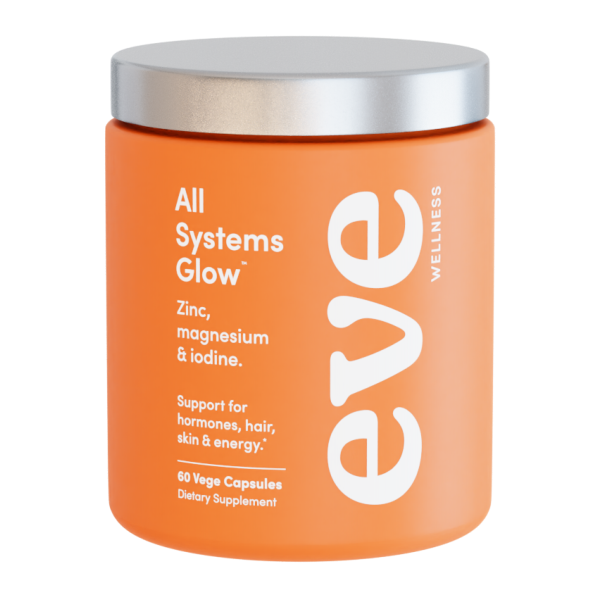 Eve All Systems Glow provides nutrients to support healthy glowing skin, balanced hormones, hair health and libido.