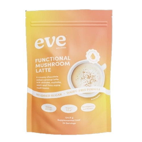 eve Functional Mushroom Latte is a creamy chocolate salted caramel latte with shiitake, maitake, reishi and lions mane mushrooms.