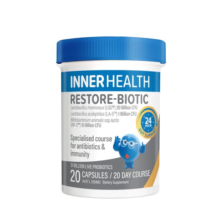 Inner Health Restore-Biotic Probiotics is designed to start releasing good gut bacteria in 30 minutes.