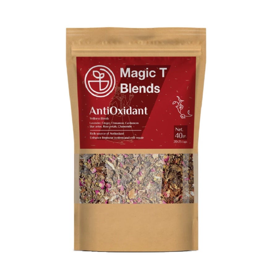 Magic T Antioxidant Tea is a delightful blend of premium tea leaves and antioxidant-rich herbs. Crafted to perfection, this tea not only tantalizes your taste buds but also provides a soothing and rejuvenating experience. Packed with natural antioxidants, this tea promotes overall well-being and supports your body's defense against harmful free radicals. Enjoy a cup of Magic T Antioxidant Tea and let its magical blend revitalize your senses.