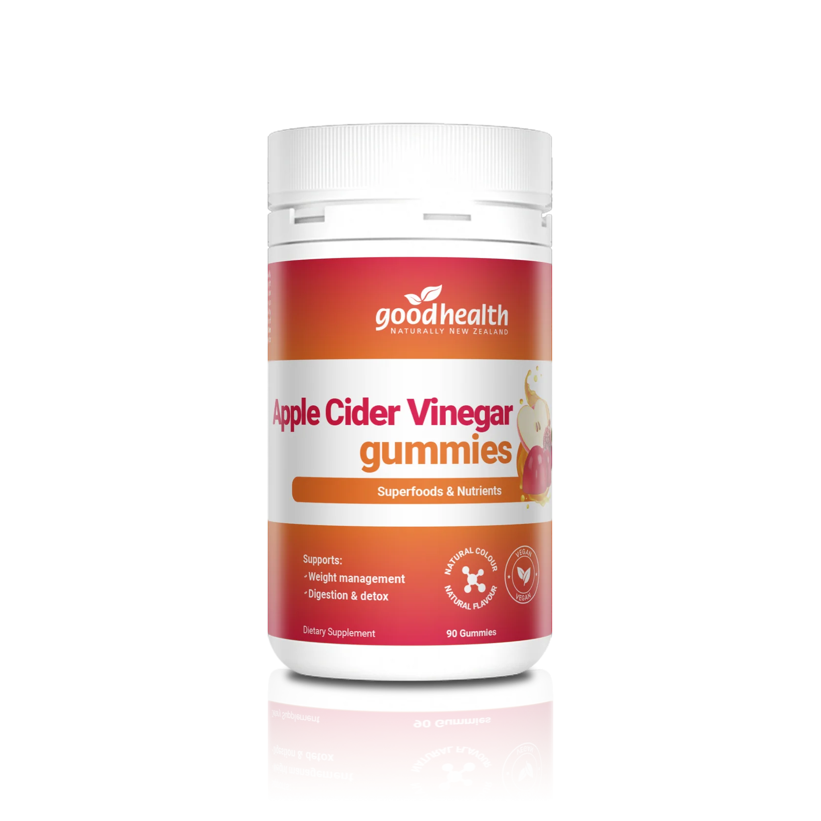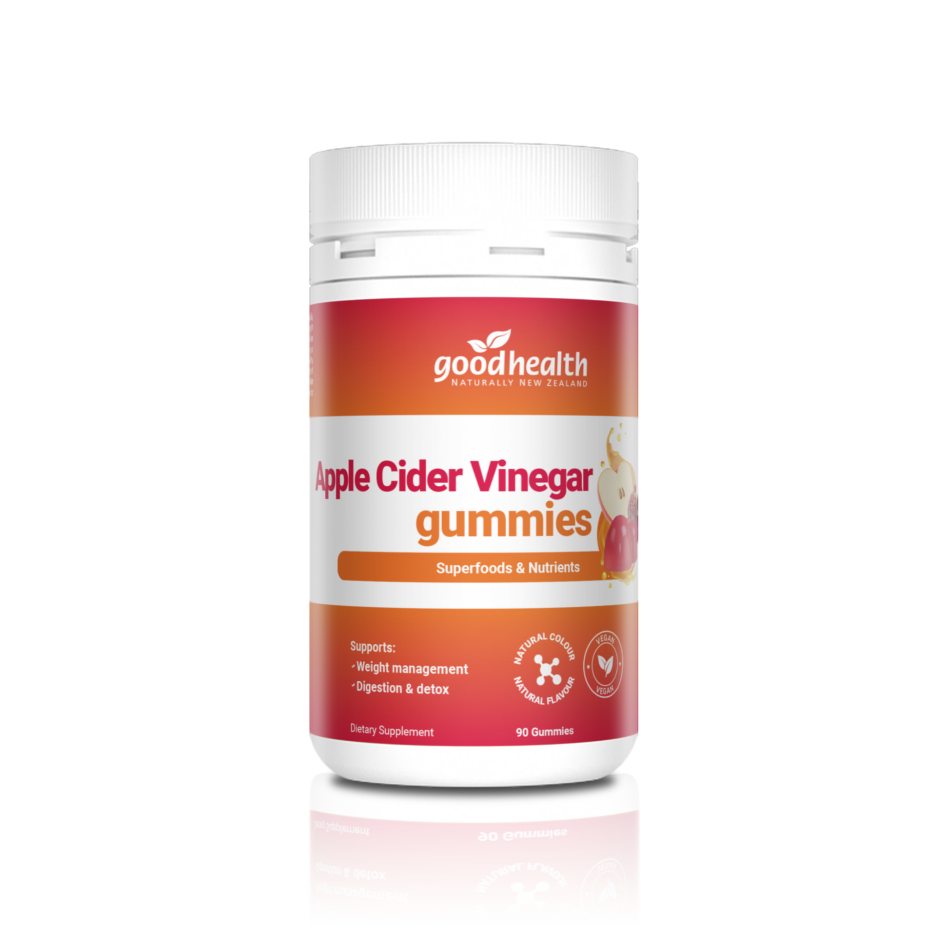 Good Health Apple Cider Vinegar gummies are delicious, natural apple-flavour, specially formulated to support digestion, detoxification, and weight management. Each gummy provides the goodness of Apple Cider Vinegar along with Superfoods Beetroot and Pomegranate, plus essential B vitamins to support daily energy production and metabolism. Apple Cider Vinegar has been shown in scientific research to support healthy blood sugar levels, a balanced gut microbiota, and a healthy weight.