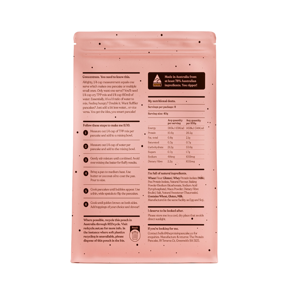 Chocolate Protein Pancake Mix is made of a royal chocolate flavour that gives a nice balanced Chocolatey taste that we think you're going to love. Don't worry even though Chocolate sounds naughty, I've got basically the same Macros as the other flavours and still leave out all the nasties like added sugar, oils, gums and GMO, so you can flip me worry-free.