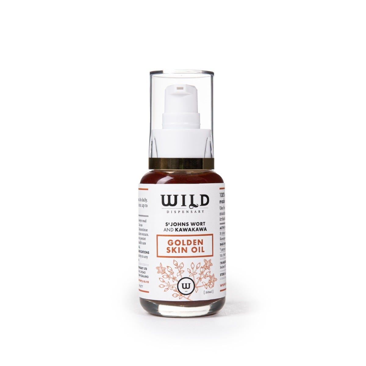 Wild Dispensary Golden Skin Oil is a 100% natural restorative oil made with St John's Wort & kawakawa. Used to support nerve and muscle pain, and to ease irritated or damaged skin.