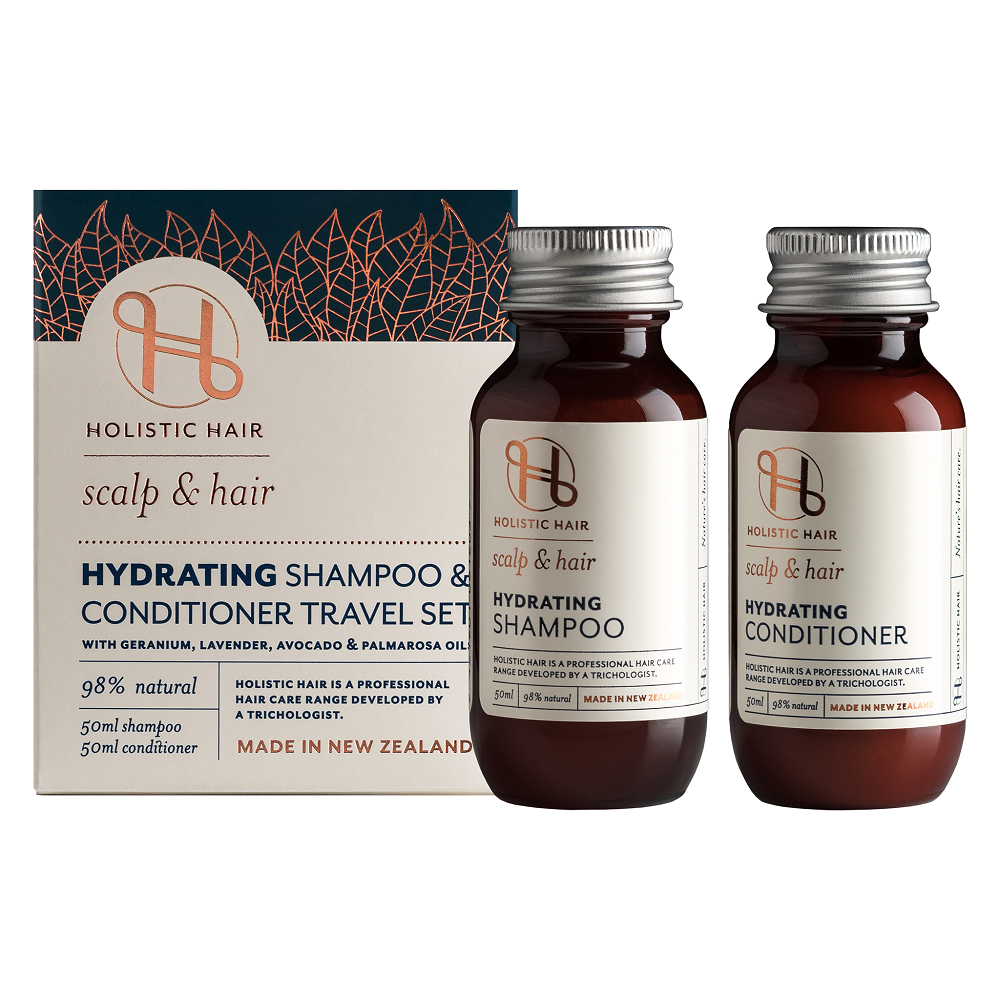 Holistic Hair Hydrating Shampoo & Conditioner Travel Set is a convenient 50ml travel size Hydrating Shampoo and Conditioner. Formulated to revive a dry scalp and dehydrated hair. Geranium and Lavender combine to cleanse and moisturise the scalp while Avocado and Palmarosa hydrate and nourish the hair. The antioxidant-rich conditioner provides protection and shine for healthy beautiful hair.