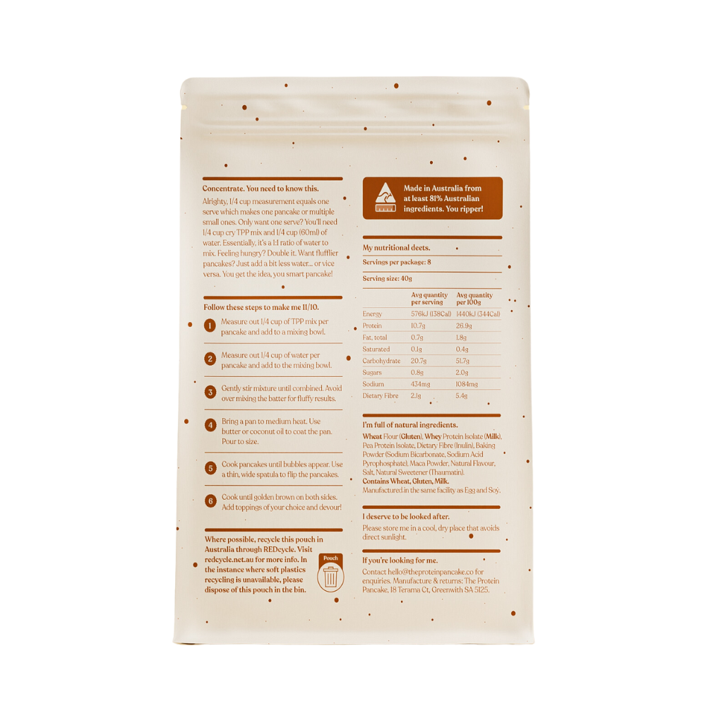 Salted Caramel Protein Pancake Mix is made of a combine a yummy caramel flavour with a smooth blend of saltiness to create a crowd-favourite pancake. It might sound surprising but most people end up loving me the most, but still leave out all the nasties like added sugar, oils, gums and GMOs, so you can flip me worry-free