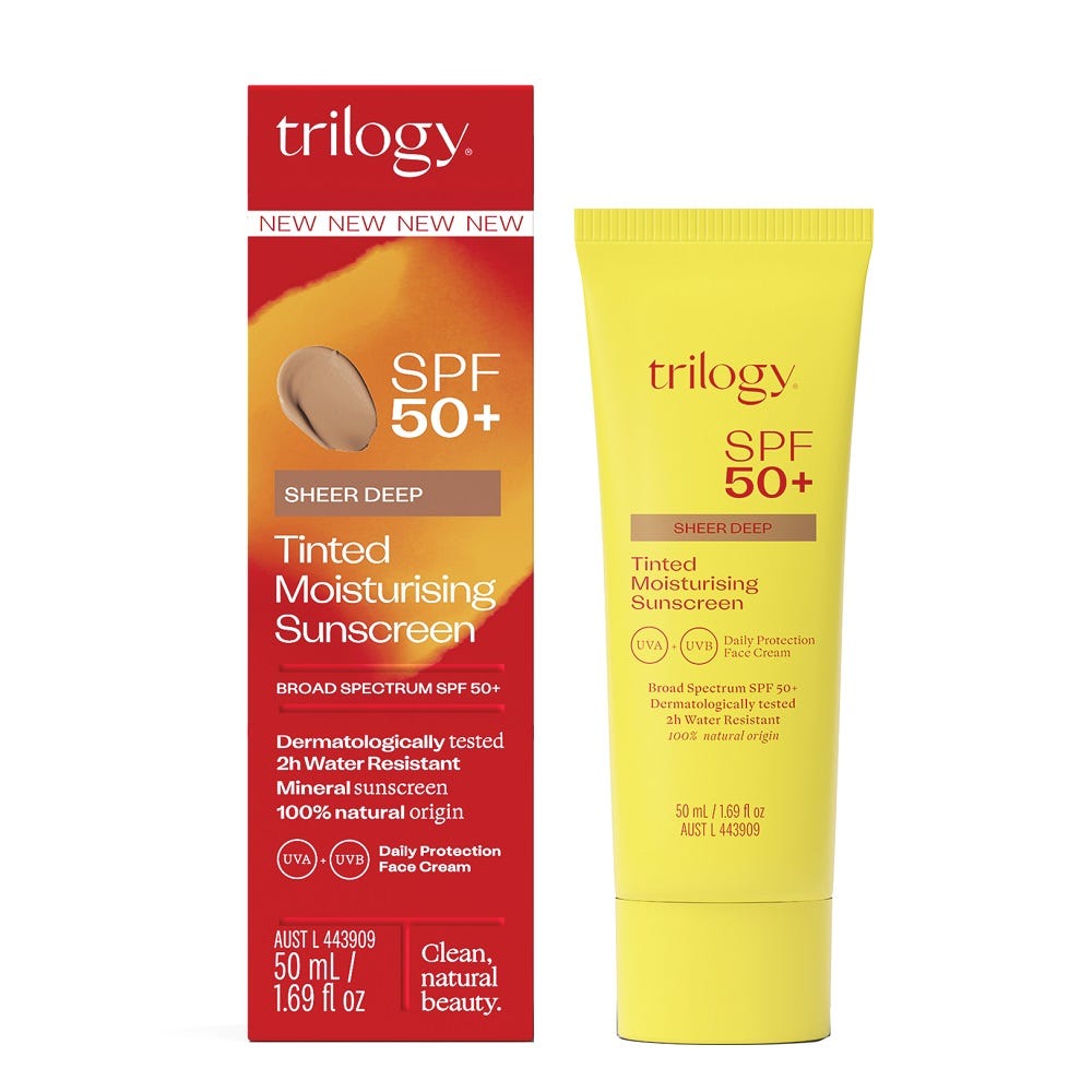 Trilogy's SPF50+ Sheer Tinted Moisturising Sunscreen is a 3-in-1 SPF 50+ tinted moisturiser with sheer blendable coverage for fair skin tones. Powerful sun protection with a dewy skin finish. Skin friendly, derm tested formula.