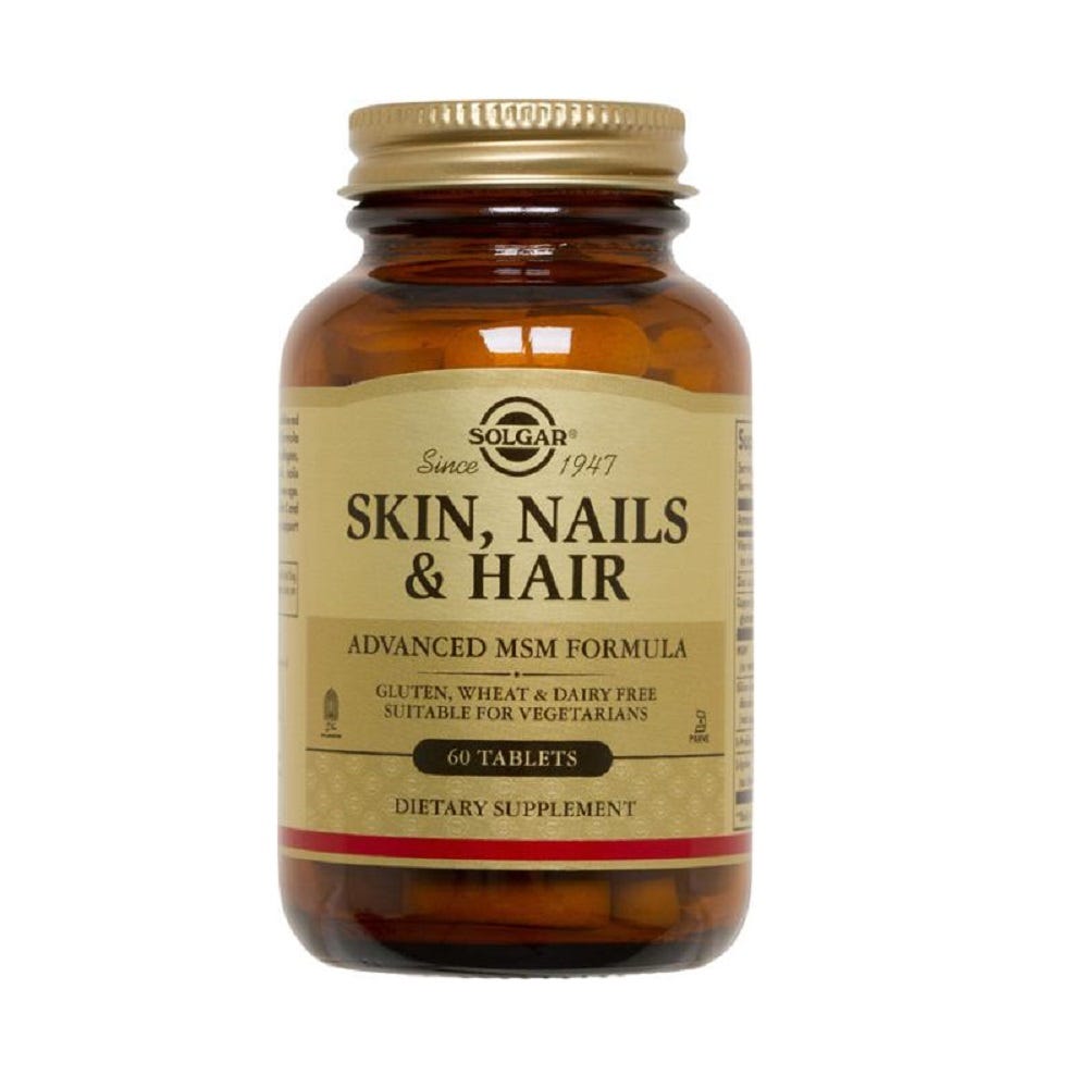 Solgar Skin, Nails and Hair is a complete formula to support healthy skin, hair and nails. The main ingredient is MSM - a sulphur which plays an essential part in the synthesis of collagen and keratin, vital protein substances that are needed to make and maintain healthy skin, hair and nails.